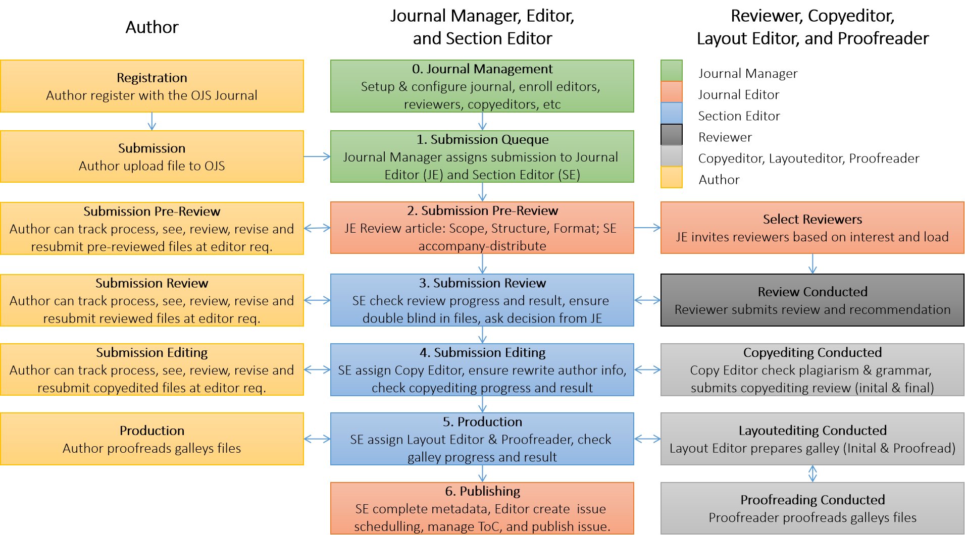 The process of publishing scientific journals through double-blind peer review, based on Open Journal Systems (OJS).